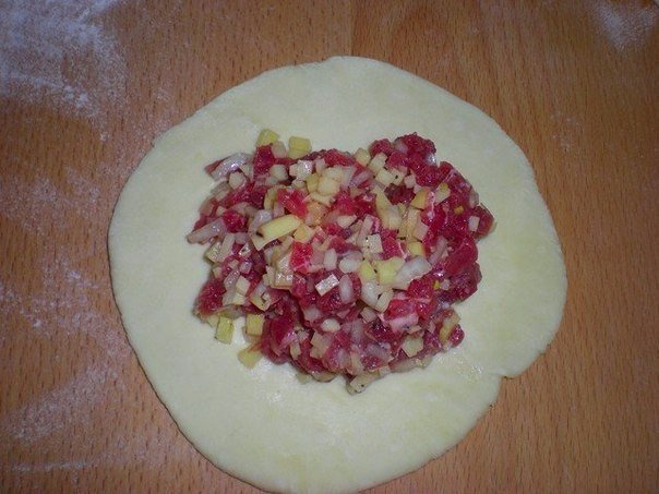 8. Выкладывать начинку по очереди на каждый круг. Всю сразу не раскладывайте, иначе начинка даст сок, и потом сложно будет защипывать края.
