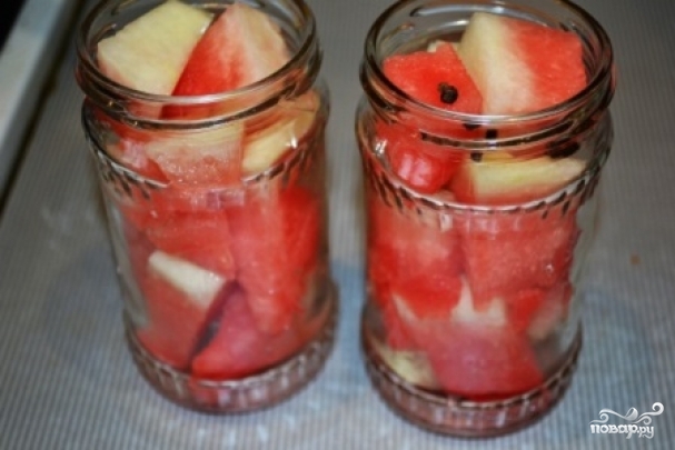 5. Арбуз разложите по банкам, добавьте к нему перец горошком. Также можно использовать другие пряности.