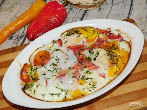 Запеченные яйца с курицей и кабачками