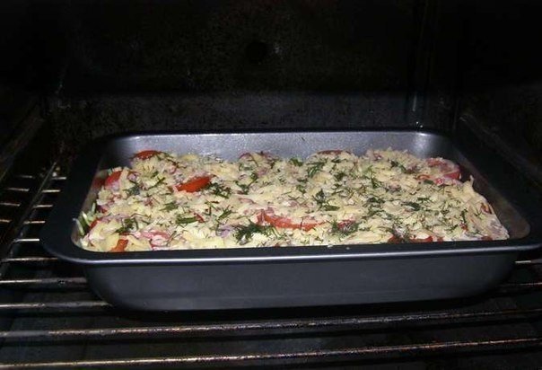 5. Форму смазать маслом, выложить половину кабачков, сверху фарш, затем опять кабачки. Выложить помидоры. Залить сметанно-яичной смесью, посыпать тертым сыром.