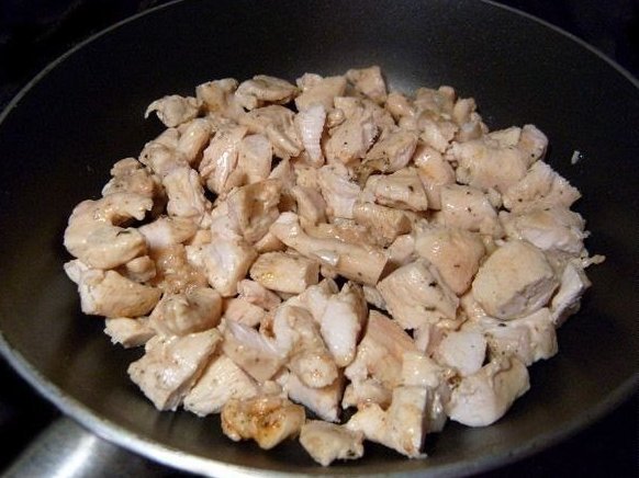 Курицу можно отварить, если вы противник жареного, но в этом варианте вкуснее куриное мясо обжарить мелкими кусочками с добавлением приправ: соли, перца, карри, сушеной зелени.