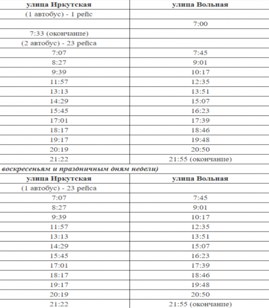 В администрацию города обратились пассажиры, пользующиеся услугами данного маршрута, с просьбой добавить в вечернее время еще один рейс. По распоряжению Главы города в расписание движения автобусов по временному маршруту № 5А «улица Иркутская – улица Вольная» введён дополнительный рейс от остановочного пункта «ул. Вольная» на 18:46, в связи с чем время отправления от остановочного пункта «ул. Иркутская» будет осуществляться в 19:17 (вместо 18:50), в 20:19 (вместо 20:06), от остановочного пункта «ул. Вольная» в 19:48 (вместо 19:28), в 20:50 (вместо 20:44).