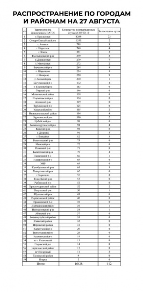 В Красноярске сегодня, 26 августа, коронавирус выявили еще у 112 человек, таким образом общее число заболевших составило 16 428 случаев.