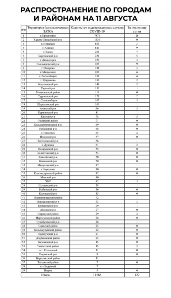 В Красноярском крае еще 122 человека заражены коронавирусом, эти данные за прошедшие сутки сообщили в оперштабе. Общее число зараженных составило 14 568 человек.