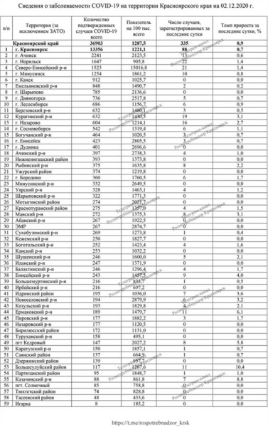 За минувшие сутки в Красноярском крае выявили на 1 заболевшего коронавирусом меньше, чем днем ранее — 335 человек заразились. Из них 88 — в Красноярске. Ко 2 декабря число заразившихся COVID-19 в регионе достигло 36 903 человека.