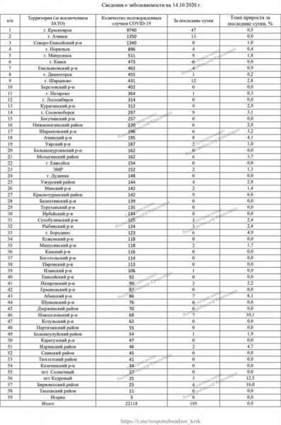 Общее число заболевших в Красноярском крае по данным на 14 октября — 22 118. Сегодня регион преодолел порог в 22 тысячи случаев заболевания.