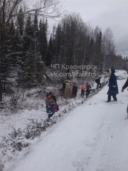Под Красноярском в кювет улетел микроавтобус с людьми. Фотографии происшествия выложили в социальных сетях очевидцы.