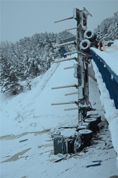 В Красноярском крае с моста упал грузовик с прицепом.