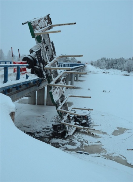 Авария произошла вчера вечером на дороге между Енисейском и пос. Усть-Кемь. При проезде моста через реку Кемь, лесовоз с прицепом врезался в ограждение и свалился с моста. На фотографиях видно, что машина лежит в реке на боку, а пустой прицеп задними колесами опирается на мост.