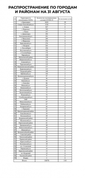 В Роспотребнадзоре Красноярского края опубликовали новые данные по коронавирусу. На сегодняшний день в крае официально ковидом болеют или уже переболели 16 870 человек. За сутки цифра выросла на 110 пациентов. Лидерами по числу заболевших стали Красноярск — 28 новых случаев, Ачинск — 8 и Дивногорск — 5 человек с диагнозом.