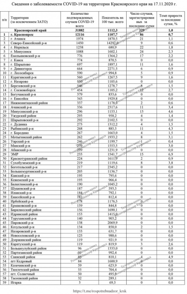 За последние сутки зафиксировано еще 20 смертей от COVID-19, с начала пандемии жертвами нового вируса в крае стали 858 человек без учета закрытых городов. Выздоровел 26 671 человек (+452 за сутки): 320 по Красноярскому краю, 63 — по Железногорску, 69 — по Зеленогорску.