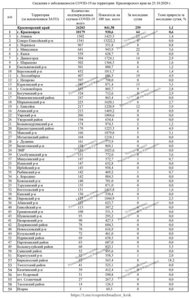 В Красноярском крае выявили новые случаи заражения коронавирусом. За все время пандемии в регионе диагноз «коронавирусная инфекция» подтвердился у 24 203 человек. Из них за последние сутки — у 259 пациентов. Большинство заболевших зафиксировали в Красноярске — 64 человека.