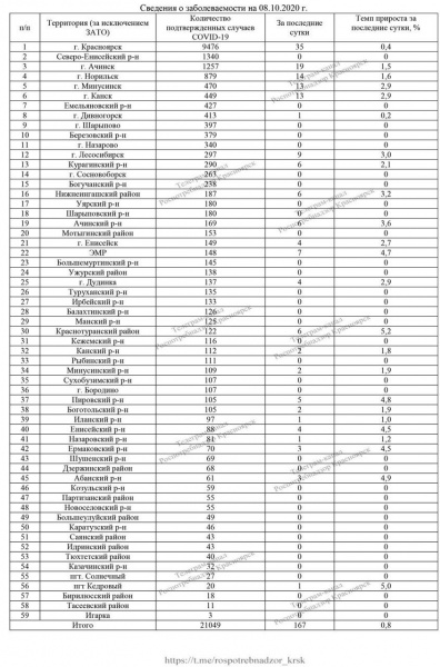 В Красноярском крае подтвердились новые случаи диагноза «коронавирусная инфекция». За сутки заболевание зафиксировали еще у 167 пациентов. Из них 35 человек — красноярцы, 19 заболевших в Ачинске, 14 — в Норильске и по 13 в Минусинске и Канске. Всего в регионе выявлено 21 049 случаев заражения. Данные сообщает краевой Роспотребнадзор.
