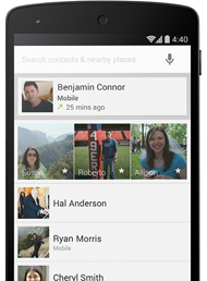 Одним из главных новшеств в 4.4 стало доработанное телефонное приложение. Во-первых, в нем теперь отображаются не только данные из адресной книги, но и контакты компаний, расположенных в географической близости. Информация черпается из Google Maps. SMS и MMS открываются в приложении Hangouts.