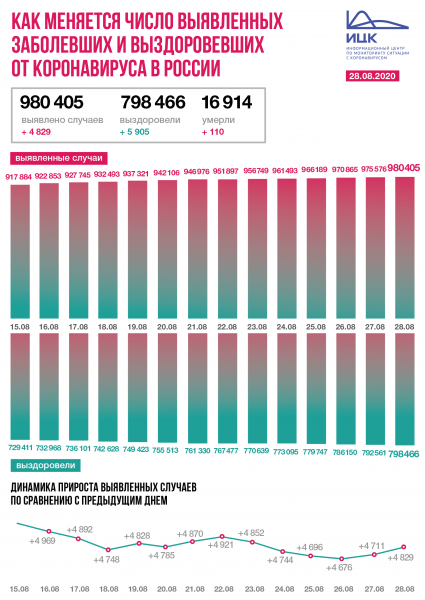 Всего на сегодняшний день зарегистрировано 980405 случаев (+0,5%) коронавирусной инфекции в 85 регионах. За весь период зафиксировано 16 914 летальных исхода, выздоровели 798 466.