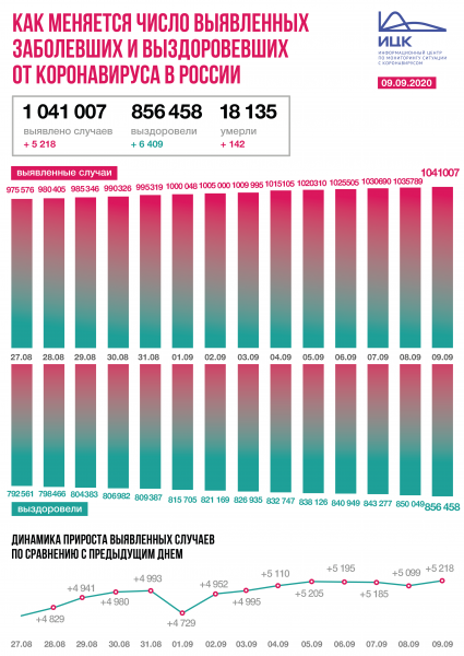 Всего на сегодняшний день зарегистрировано 1 041 007 случаев (+0,5%) коронавирусной инфекции в 85 регионах. За весь период зафиксировано 18 135 летальных исходов, выздоровели 856 458.